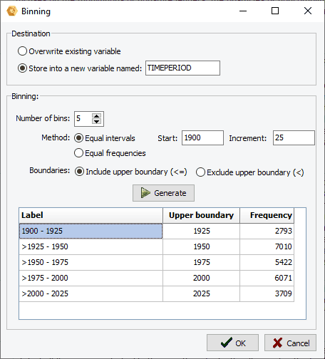 A binning feature can now be used to transform continuous values into a smaller number of distinct categories. It may be used to reduce the effect of numerical outliers, abnormal distributions, or convert a continuous numerical variable into an ordinal one. It is especially useful for creating graphic displays of comparisons when the number of distinct values in the numerical variable is too high.