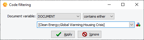 - Filtering of responses based on the number of codes (uncoded, coded, more than n codes, etc.) as well as on the presence or absence of specific codes.