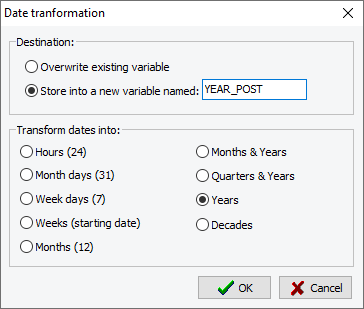 A new numerical transformation dialog box allows you to compute numerical variables from other variables with up to 50 transformation functions including trigonometric, statistical, random number functions. Conditional transformation can also be performed using an IF-THEN-ELSE logical structure.