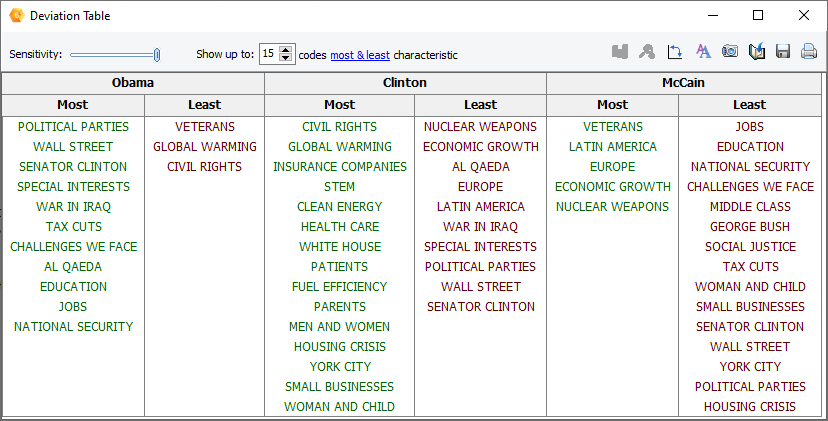 The CODING BY VARIABLES feature now offers the possibility to produce a deviation table that allows one to obtain a list of codes most or least characteristic of different values of an independent variable as compared to other classes of this variable.