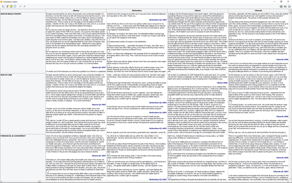 The quotation matrix allows you to create a large grid containing all coded text segments and/or comments where each cell represents the intersection of a specific code with either a specific case or a value of a categorical or numerical variable (age group, gender, source, etc.). Such a joint display provides a compact view of coded material ideal for reviewing work done by coders. More easily identify patterns, creating dense summaries of results, etc. This matrix may be created from the new RETRIEVAL | QUOTATION MATRIX command to obtain a codes x cases quotation matrix or from the ANALYSIS | CODING BY VARIABLES command for displaying coded materials by all values of a variable. It supports the following features: