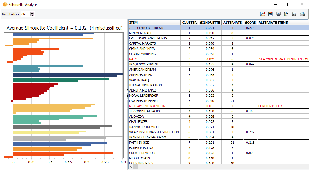 A new silhouette plot feature has been added to the hierarchical cluster analysis, allowing one to assess the quality of the cluster solution and identify potential misclassified items.