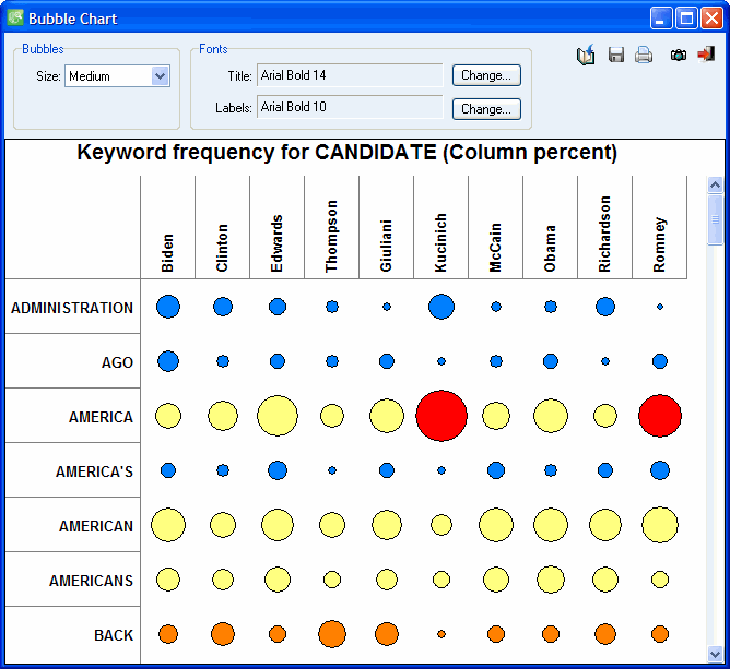 The bubble chart is a graphic representation of crosstab tables where relative frequencies are represented by circles of different diameters. This type of chart allows one to quickly identify high and low frequency cells and is thus especially useful for presentation purposes. Many features of the chart can be customized to highlight specific findings. Rows and columns can be moved freely or deleted, and one can adjust the color of each cell as well as the fonts used.