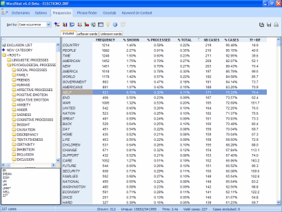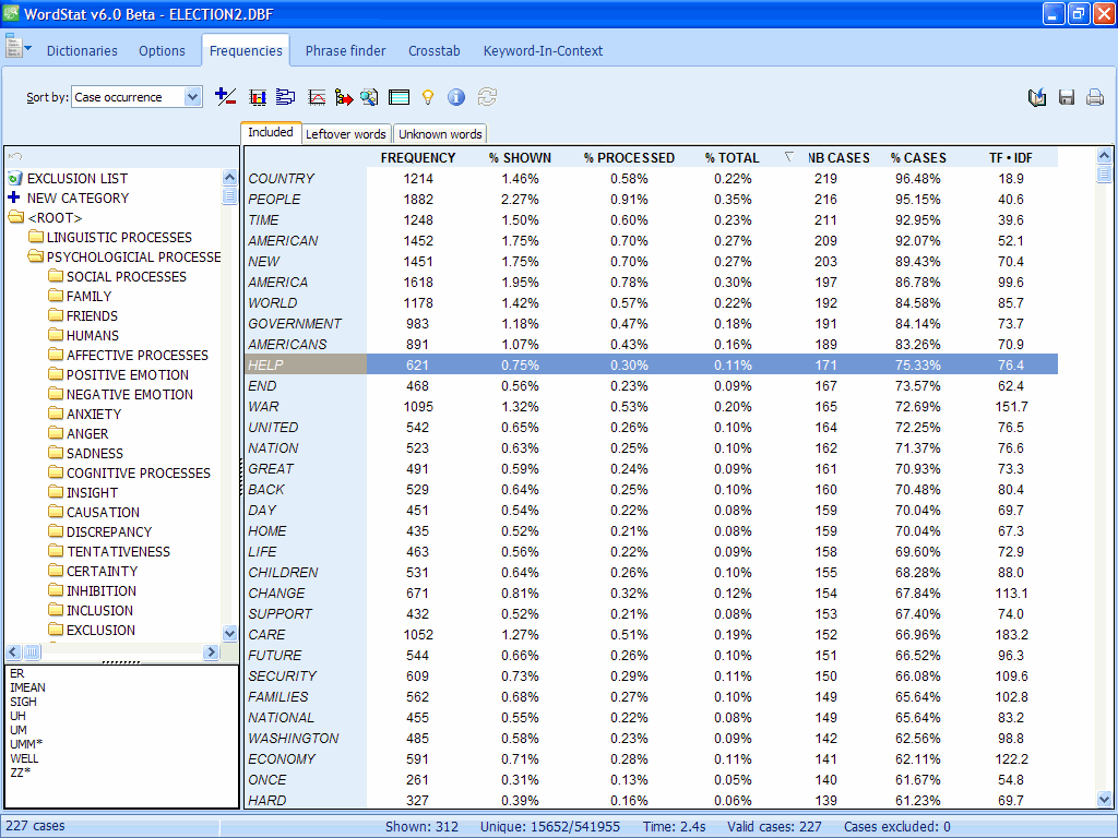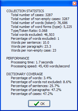 On the FREQUENCIES page, a new button allows one to get various document statistics (number of words, sentences, paragraphs, words per sentence, etc.) and assess the coverage of the content analysis dictionary (percentage of words, sentences, paragraphs, documents and cases containing categorized items).