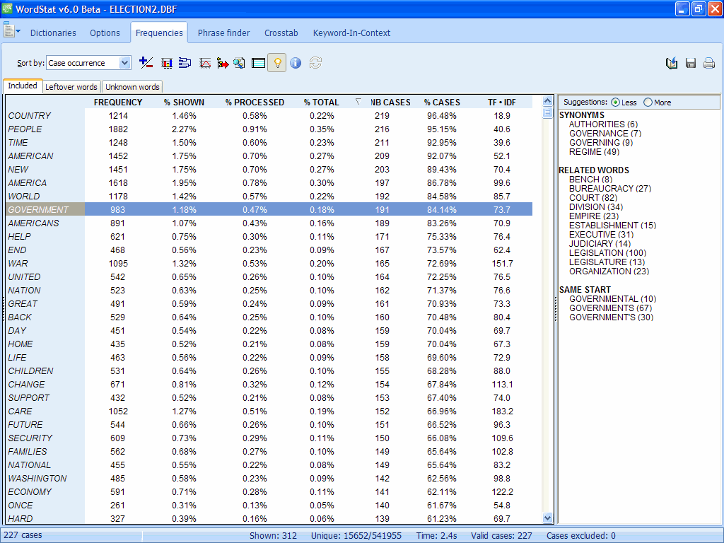 On the frequency page, an optional panel (right) automatically shows for the selected items (words or content categories) all related leftover words (synonyms, antonyms, hyponyms, hypernyms, words with same stem, etc.), allowing one to select relevant ones and assign them to a category. Please note that this feature is fully functional only when analyzing English document. When analyzing documents in other languages, the panel will show words with a similar root form.
